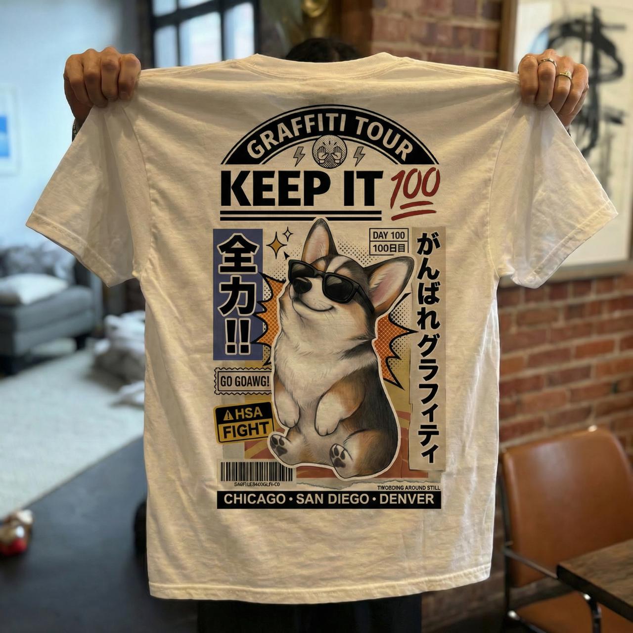 The complete set created to celebrate this milestone. At the center is the Day 100 shirt, featuring artwork inspired by Japanese design traditions that honor perseverance and strength through adversity.